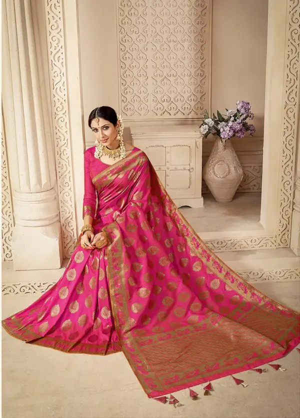 Kad Creations Indian women Banarasi Silk heavy zari weaving and Tassel Pallu work Pink Party wear Saree