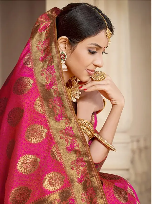 For A Proper Traditional Look, Grab This  Pink Indian Bollywood Designer Party wear Traditional wedding Banarasi Silk Saree, completed with heavy zari weaving and Tassel Pallu work. It will carry Pink unstitched Art Silk Blouse piece, which can be customize up to max 42 Indian standard size and its length 80 Cms. You can wear this saree in party wedding function and any other occasion. (Slight variation in color is possible due to flash used during photo shoot.)
